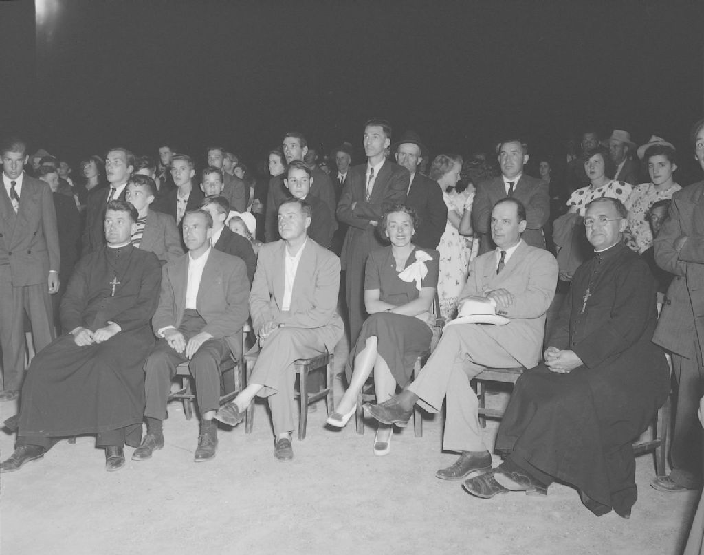 Séance cinématographique éducative sur la prévention des accidents de l'onde. Un religieux, Paul Mecteau, surveillant de district de la Croix-Rouge, monsieur Jules Savard membre de la Croix-Rouge, madame Jules Savard, secrétaire, l'Honorable Joseph-Damase Bégin, Ministre de la colonisation, un religieux. Lac Etchemin, 1949, Archives nationales à Québec, Fonds Ministère de la Culture et des Communications, (03Q,E6,S7,SS1,D2,P71146), Neuville Bazin.