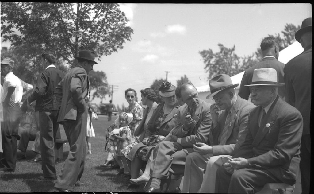 M. Georges Bouchard, sous-ministre adjoint à Ottawa, avec J.P. Fleury, propagandiste de l'Industrie animale, à la ferme expérimentale de L'Assomption, 1942, Archives nationales à Québec, Fonds Ministère de la Culture et des Communications, (03Q,E6,S7,SS1,D2,P7145), François Fleury.