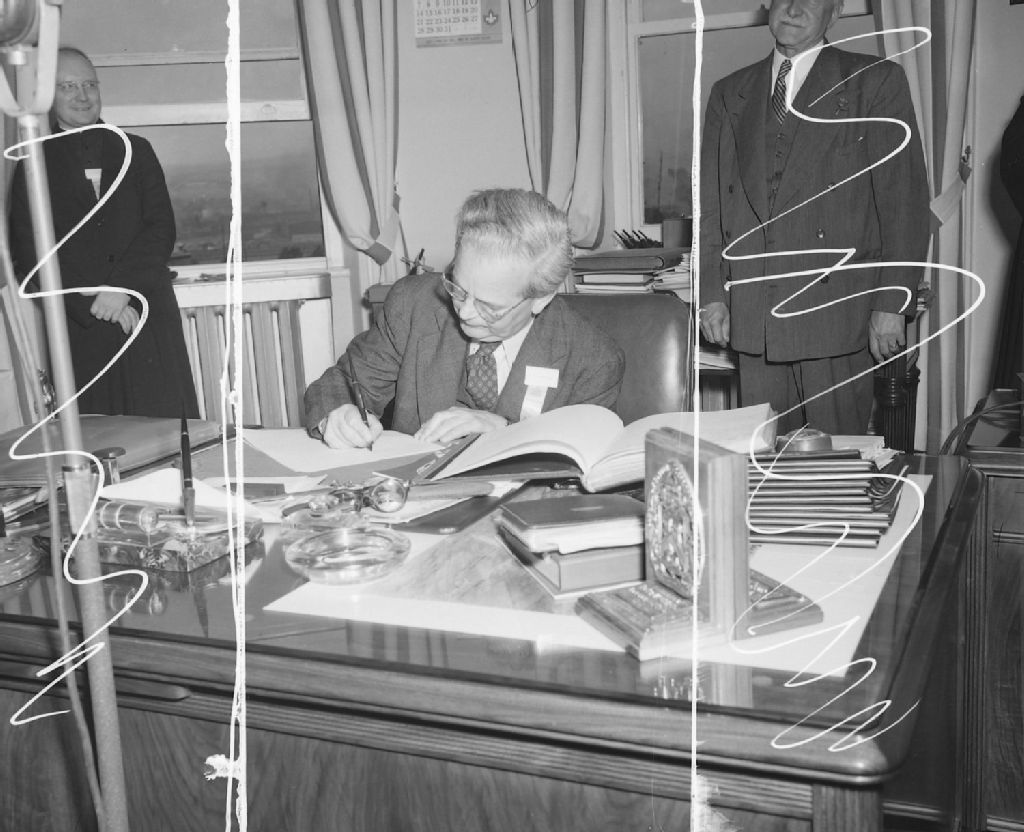 Monsieur Louis Charbonneau, Président de l'Association canadienne des éducateurs de langue française, signant son nom dans le Livre d'or de la Cité de Québec. Hôtel de ville de Québec