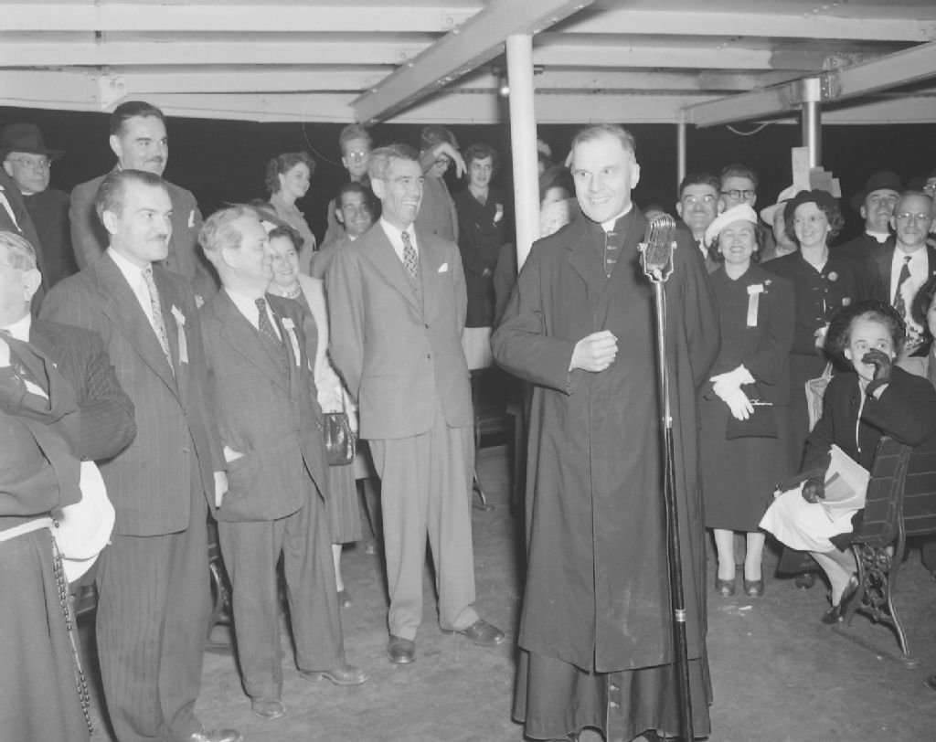 Le Chanoine Drouin de Montréal prononçant une allocution au nom de la Commission scolaire de la Métropole. À bord du Louis-Jolliet, 1949, Archives nationales à Québec, Fonds Ministère de la Culture et des Communications, (03Q,E6,S7,SS1,D2,P71579), Neuville Bazin.