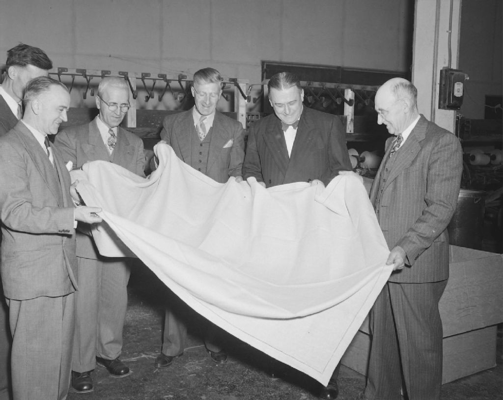 Visite des industries du lin à Plessisville avec monsieur Latulippe, 1950, Archives nationales à Québec, Fonds Ministère de la Culture et des Communications, (03Q,E6,S7,SS1,D2,P74610), Neuville Bazin.
