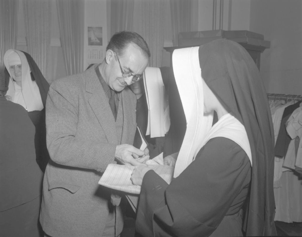 Monsieur Josserand et une religieuse examinant un ouvrage. École supérieure de Limoilou