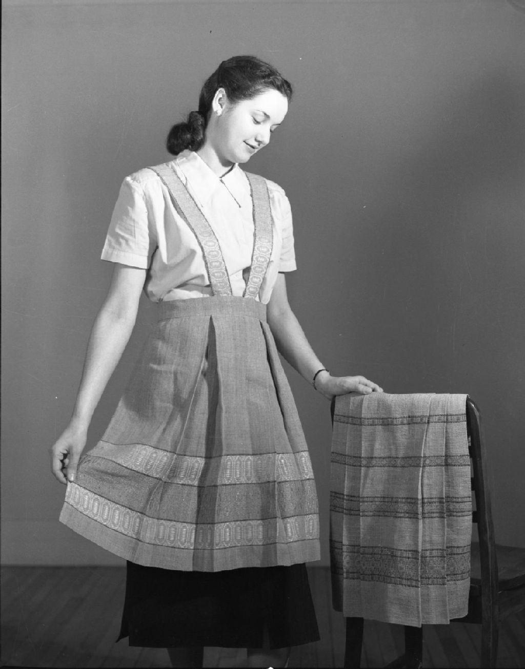Tabliers tissés pour publication. Arts domestiques., 1950, Archives nationales à Québec, Fonds Ministère de la Culture et des Communications, (03Q,E6,S7,SS1,D2,P75961), Omer Beaudoin.