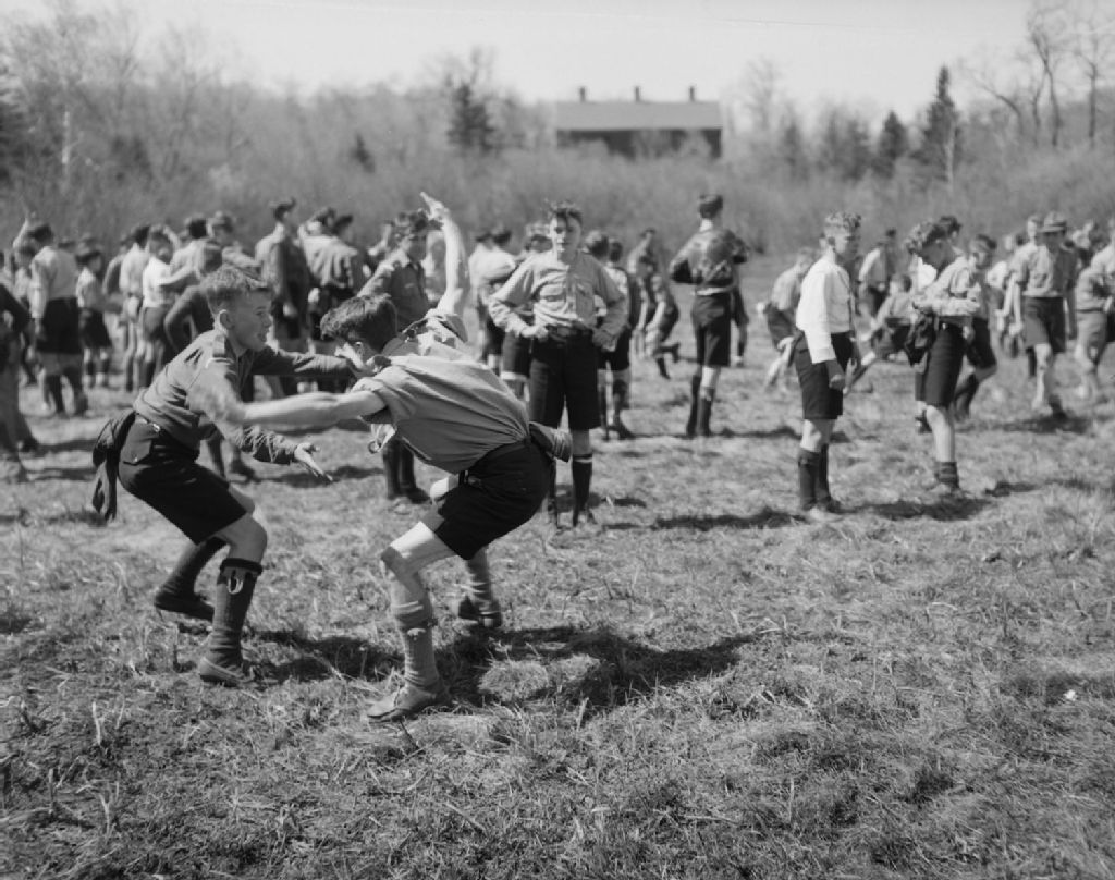 Prise de foulard. Camp Taschereau, 1950, Archives nationales à Québec, Fonds Ministère de la Culture et des Communications, (03Q,E6,S7,SS1,D2,P76621), Neuville Bazin.