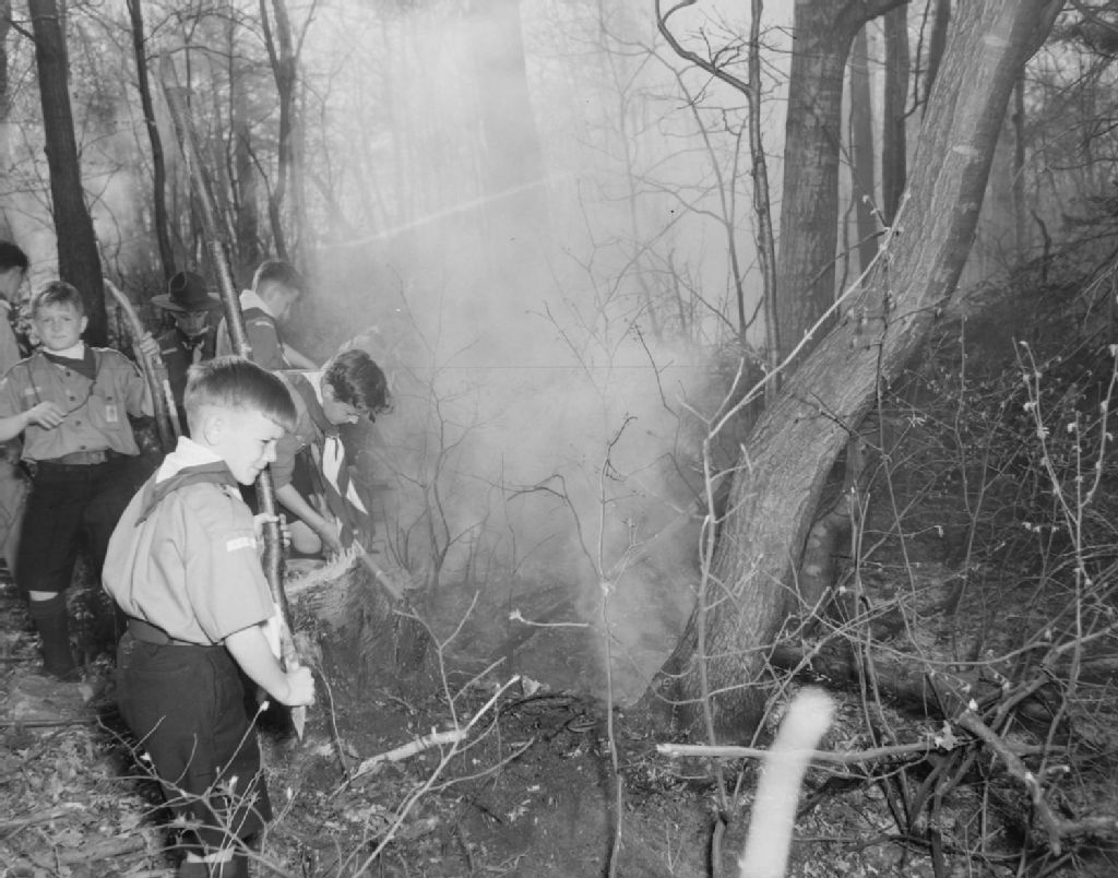 Scouts en train de combattre un feu de broussailles. Camp Taschereau