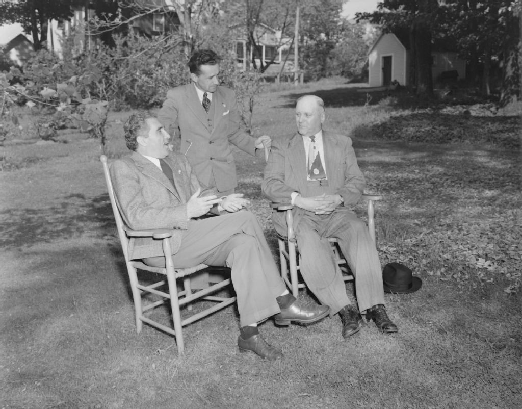 Musée Laurier. Pelouse à l'arrière. Monsieur Wilfrid Labbé, M.A.L., causant avec Gustave Vekman et Paul Rainville. Arthabaska