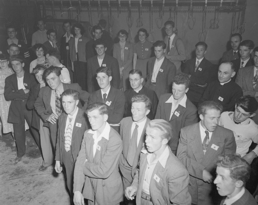 Jeunes agriculteurs de Bellechasse et Dorchester. Poste d'abattage de volailles de Saint-Anselme. Groupe pendant la démonstration sur le fonctionnement des machines. Saint-Anselme, comté de Dorchester
