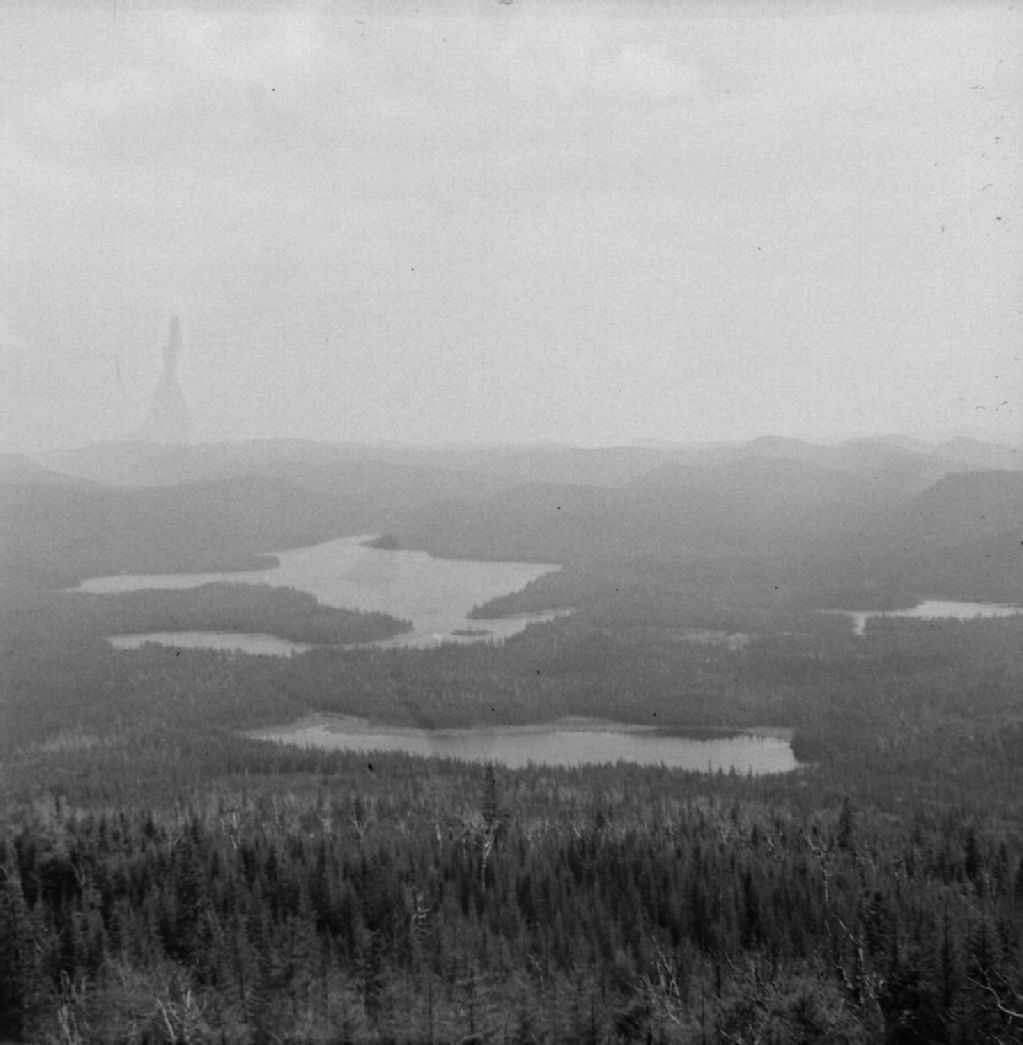 Vue prise du haut de la tour Gregory regardant vers le Lac Gregory, le camp de la tour est situé sur l'île qui apparait sur le lac Gregory, parc des Laurentides, 1950, Archives nationales à Québec, Fonds Ministère de la Culture et des Communications, (03Q,E6,S7,SS1,D2,P77562), Gérard Paquet.