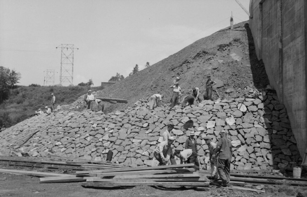 Pont de Québec sur le fleuve Saint-Laurent entre Sainte-Foy comté Québec et Saint-Nicolas comté Lévis, 1950, Archives nationales à Québec, Fonds Ministère de la Culture et des Communications, (03Q,E6,S7,SS1,D2,P78196), Camille Milot.