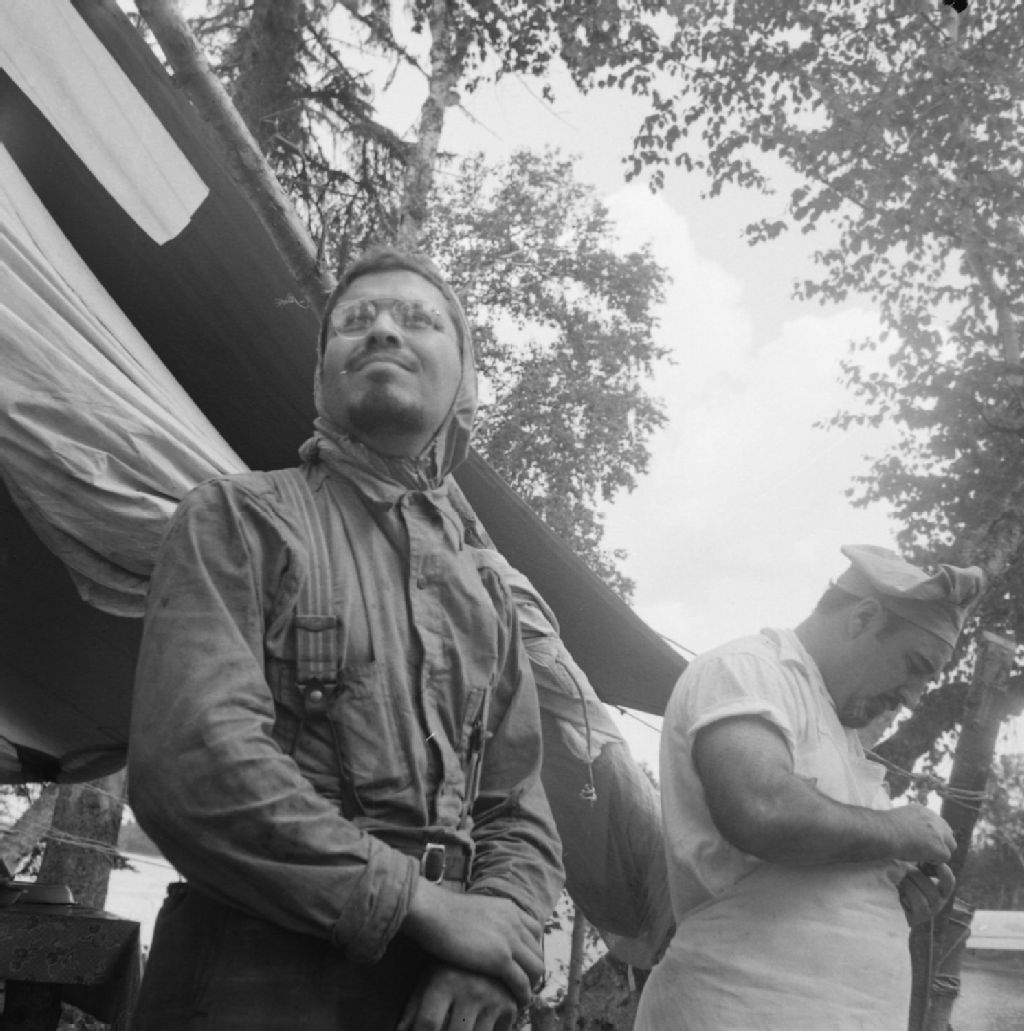 Qu'est-ce qui inspire cet Egyptien Roger Moussalli tandis que le cuisinier Jean Charles Blackburn s'occupe de choses matérielles, canton Thémines, 1950, 1950, Archives nationales à Québec, Fonds Ministère de la Culture et des Communications, (03Q,E6,S7,SS1,D2,P78848), Gérard Ouellet.