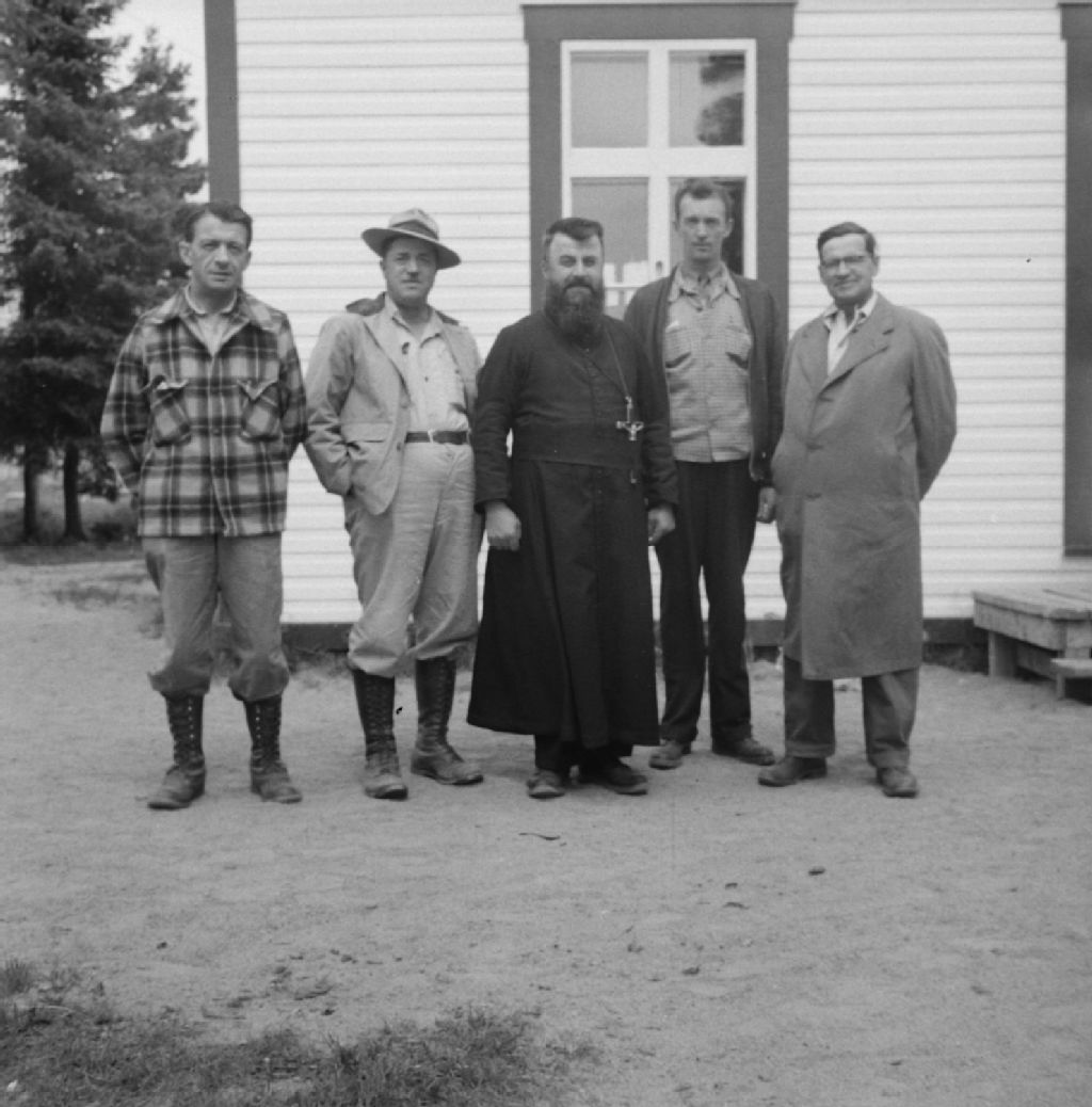 Devant la maison des pères Oblats de gauche à droite: Jean Baptiste Poulito, Clovis Melançon, R.P Damase Couture, O.M.I., supérieur Bob Birckett et Jean Parrot , Fort George, Baie James