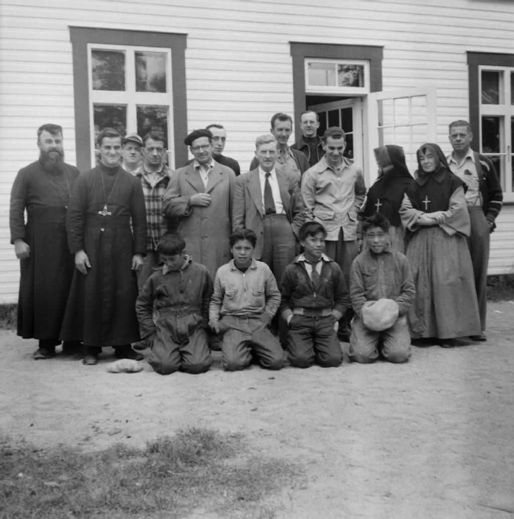 Le supérieur le R.p Damase Couture et quelques résidents de la mission de Fort George avec quelques visiteurs,Fort George, Baie James