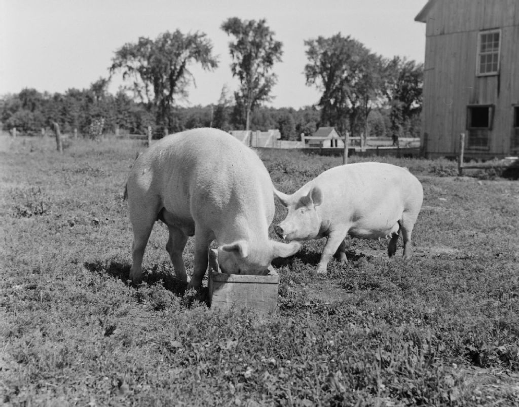 Truie et cochonnets chez Jean-Paul Pilon. Saint-Clet, comté Soulanges., 1950, Archives nationales à Québec, Fonds Ministère de la Culture et des Communications, (03Q,E6,S7,SS1,D2,P79636), Omer Beaudoin.