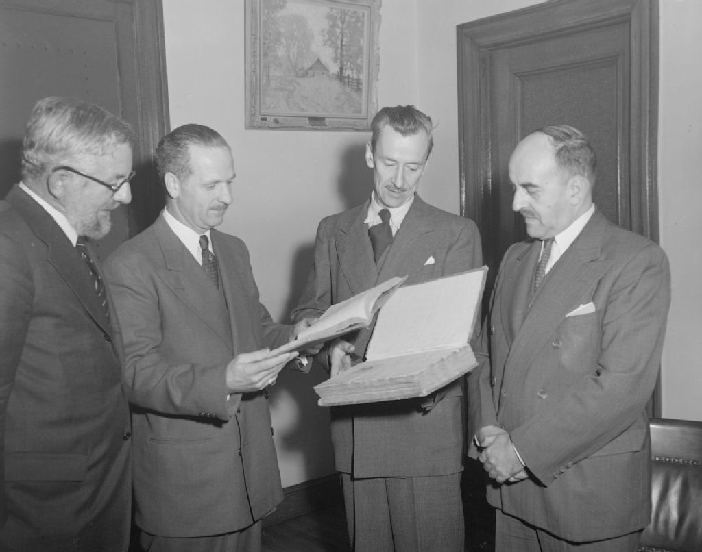 L'honorable Coté remettant à l'archiviste de la province deux manuscrit sur la flore canadienne rédigés par Jean François Gauthier, à la demande du Marquis de la Galissonnière. Secrétariat de la province