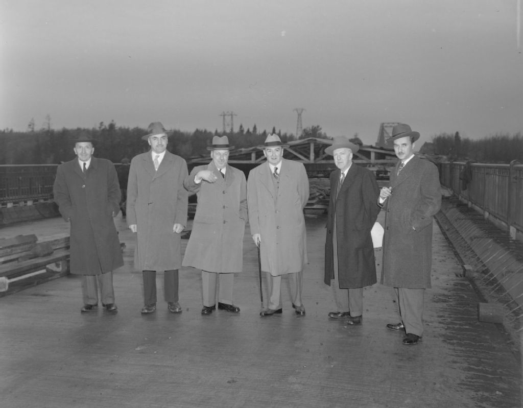 Inspection officielle par le Premier ministre, Maurice Duplessis, des travaux effectués sur le pont de Québec et au nouveau pont de la Chaudière, 1950, Archives nationales à Québec, Fonds Ministère de la Culture et des Communications, (03Q,E6,S7,SS1,D2,P81148), Neuville Bazin.