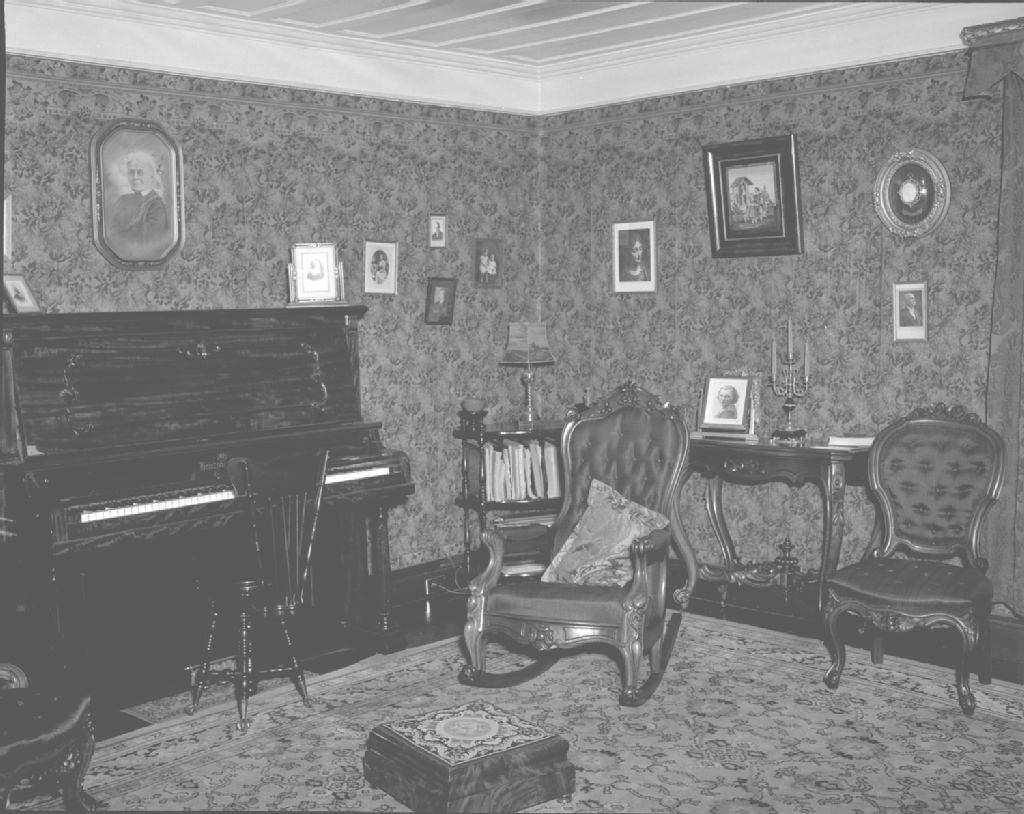 Coin du salon de Sir Thomas Chapais avec le piano à l'arrière-plan. Saint-Denis-de-Kamouraska