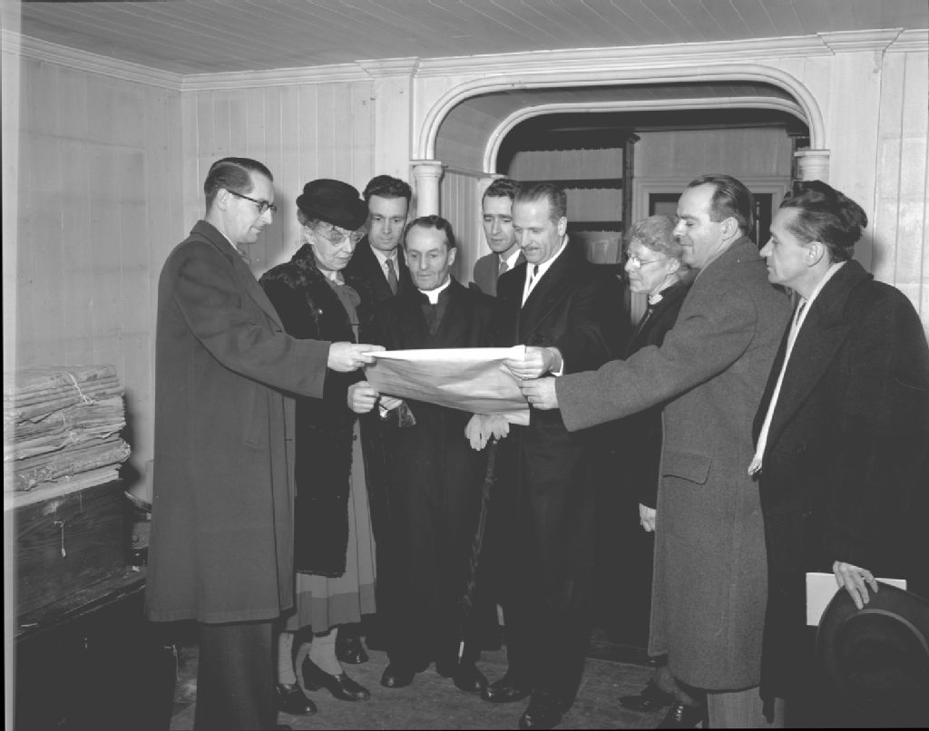 Les officiels examinant un document de la collection de Sir Thomas Chapais. M. G. Vakeman et R. E. Fontaine se trouvant chacun aux extrême de la photo. Saint-Denis de Kamouraska