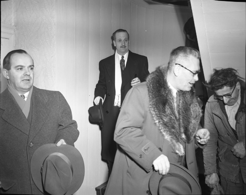 L'honorable Omer Coté précédé des députés provinciaux Gagné et Plourde descend l'escalier intérieur de la maison de Sir Thomas Chapais. Saint-Denis de Kamouraska