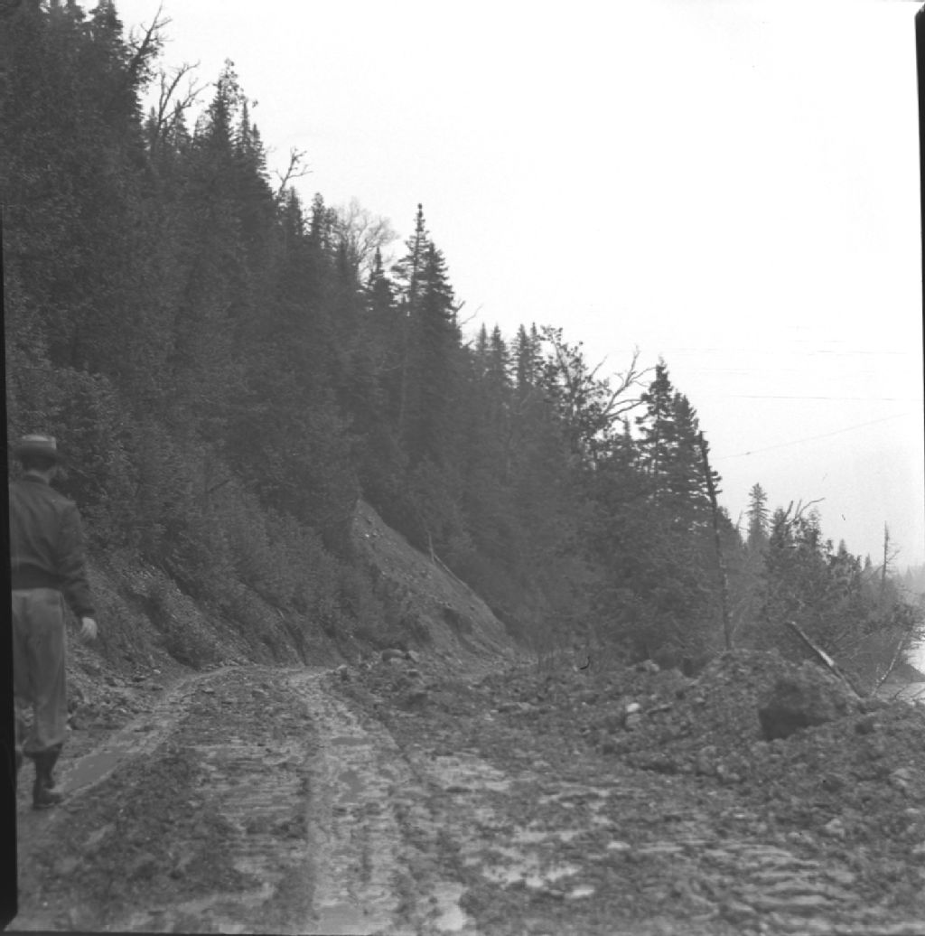Landslide on Cascapédia road to federal mine. Cascapédia., 1950, Archives nationales à Québec, Fonds Ministère de la Culture et des Communications, (03Q,E6,S7,SS1,D2,P82495), H.A. Gray.