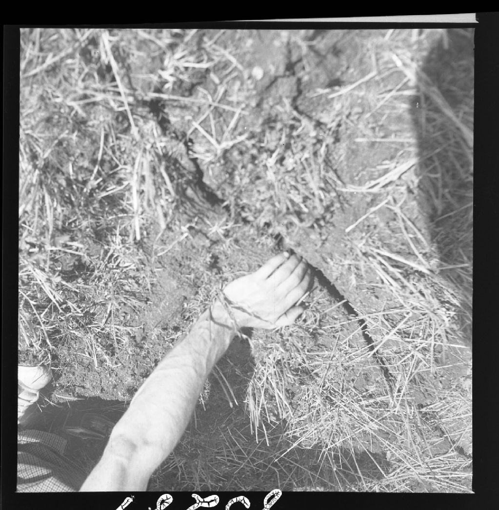 Nombreuses fissures longues et larges de quelques pouces dans un limon sableux sur les poteaux, dues à la contraction du sol par suite de l'alternance des gels et des dégels. Sainte-Monique-de-Honfleur, comté Roberval, 1950, Archives nationales à Québec, Fonds Ministère de la Culture et des Communications, (03Q,E6,S7,SS1,D2,P83289), Auguste Mailloux.