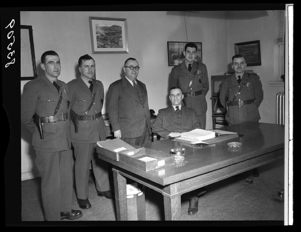 Officiers de circulation en devoir durant toute la semaine de prévention des accidents de la route. De gauche à droite: Off. Gérard Cochrane et Jos Godbout; L . P. Majeau, directeur du personnele de Ste-Anne Paper Company. Assis: Gordon J. Morissette, gérant de Ste-Anne Paper Company; Off. Paul Fortin et P. Henri Tremblay