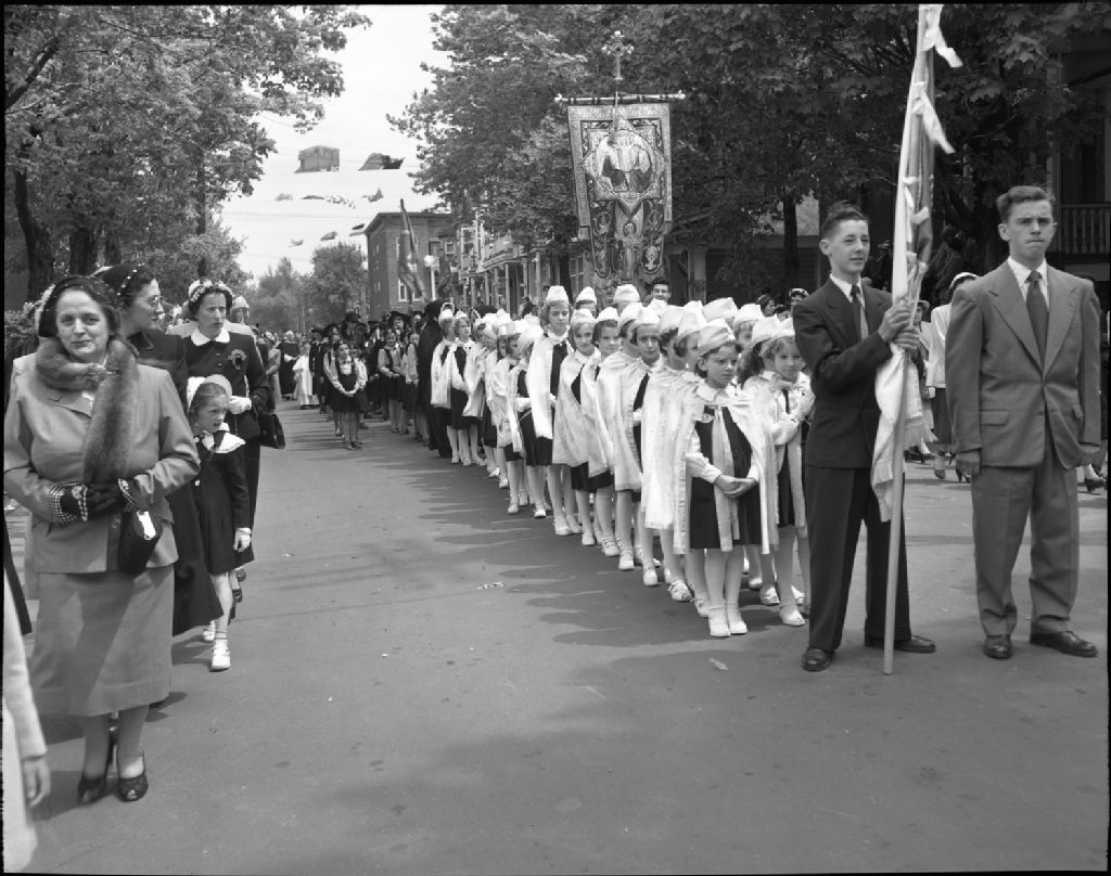 Procession de la Fête-Dieu Saint-Dominique. Québec, 1951, Archives nationales à Québec, Fonds Ministère de la Culture et des Communications, (03Q,E6,S7,SS1,D2,P84760), Neuville Bazin.