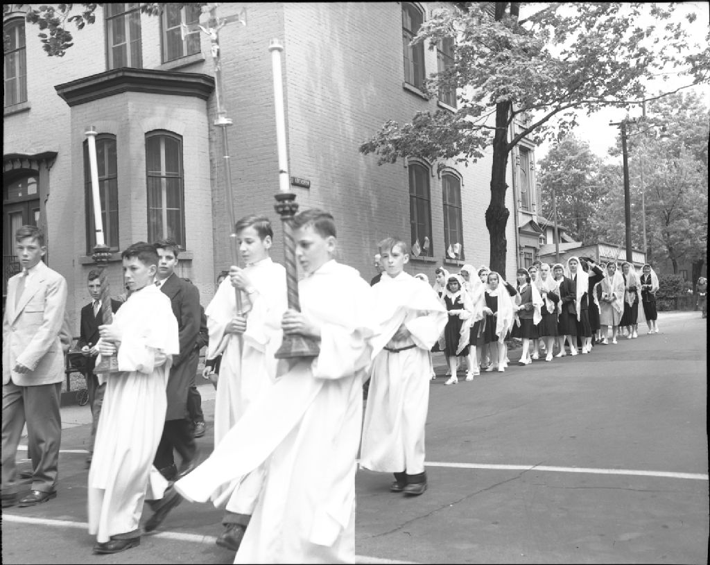 Procession de la Fête-Dieu Saint-Dominique. Québec, 1951, Archives nationales à Québec, Fonds Ministère de la Culture et des Communications, (03Q,E6,S7,SS1,D2,P84761), Neuville Bazin.