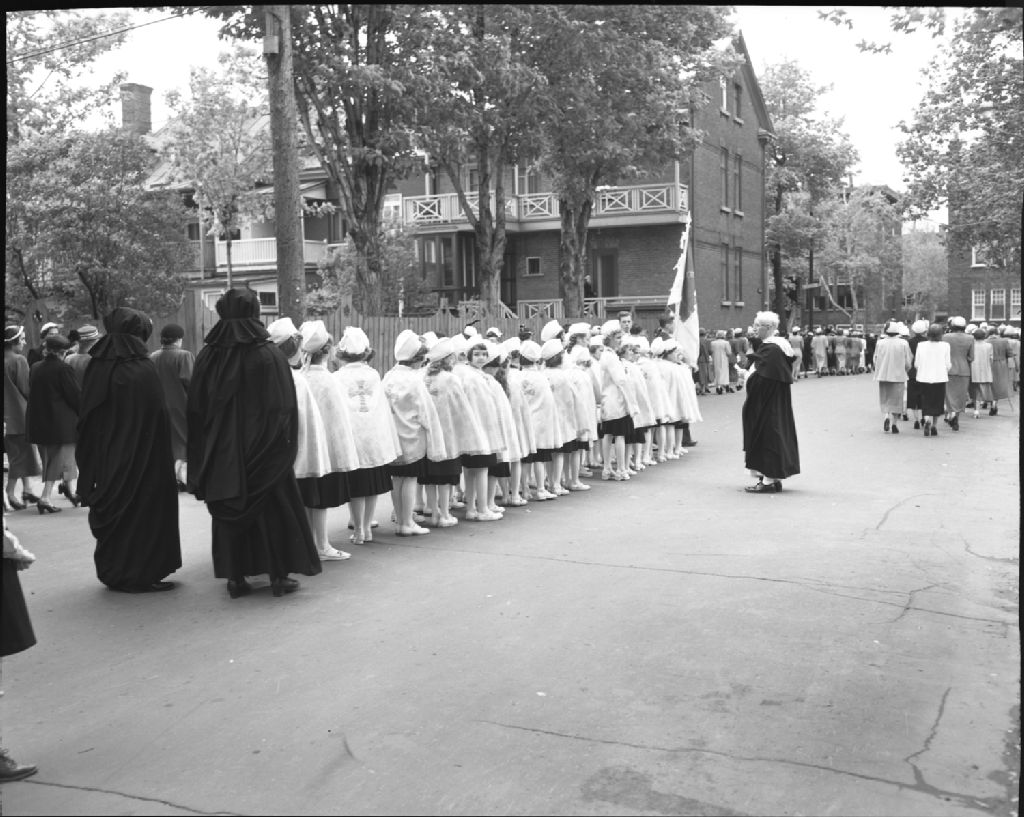 Procession de la Fête-Dieu Saint-Dominique. Québec, 1951, Archives nationales à Québec, Fonds Ministère de la Culture et des Communications, (03Q,E6,S7,SS1,D2,P84762), Neuville Bazin.