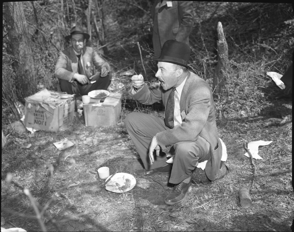 Défilé pour la protection des forêts - A.Roberge, assistant-gérant de la Sainte-Anne Power se régale de fèves au lard, Saint-Féréol, comté de Montmorency, 1951, Archives nationales à Québec, Fonds Ministère de la Culture et des Communications, (03Q,E6,S7,SS1,D2,P84789), Neuville Bazin.