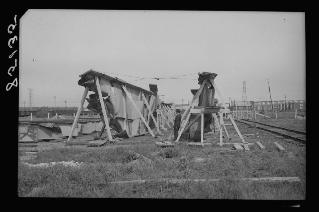 Pont Duplessis sur la rivière Saint-Maurice à Trois-Rivières. Matériel récupéré de la première travée sur un terrain d'entreposage à Trois-Rivières, 1951, Archives nationales à Québec, Fonds Ministère de la Culture et des Communications, (03Q,E6,S7,SS1,D2,P85135), Olivier Desjardins.