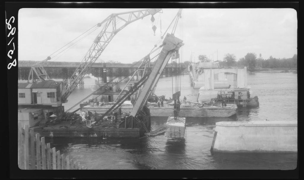 La colonne en amont de l'arche numéro 1 du pont Duplessis qui a été détachée de l'arche et déposée sur le lit de la rivière