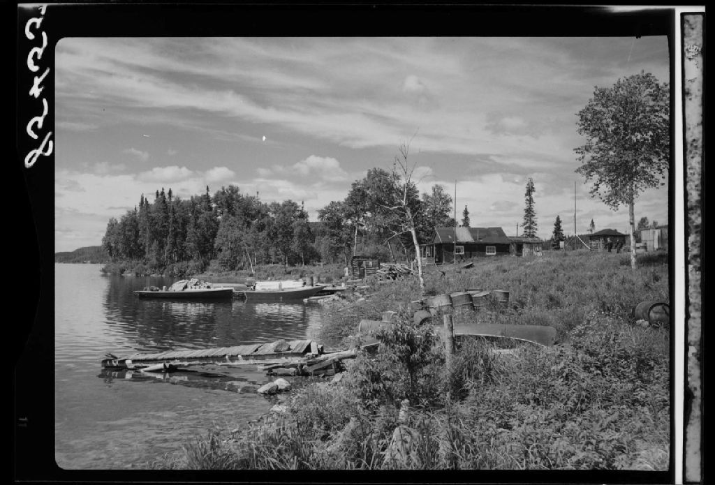 Magasin de M. Edmond l'Italien, Baie des Cèdres, lac aux Dorés. Chibougamau., 1951, Archives nationales à Québec, Fonds Ministère de la Culture et des Communications, (03Q,E6,S7,SS1,D2,P85455), Paul Carpentier.
