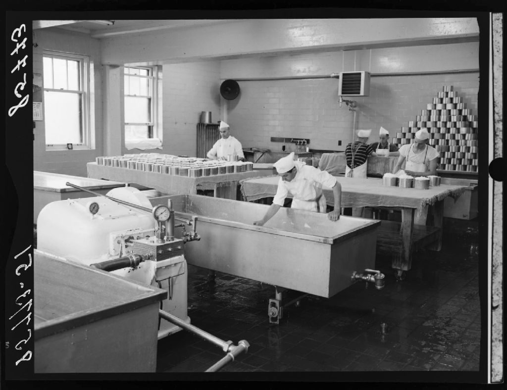 Intérieur de la fromagerie des Bénédictins à Saint-Benoît-du-Lac., 1951, Archives nationales à Québec, Fonds Ministère de la Culture et des Communications, (03Q,E6,S7,SS1,D2,P85773), Omer Beaudoin.