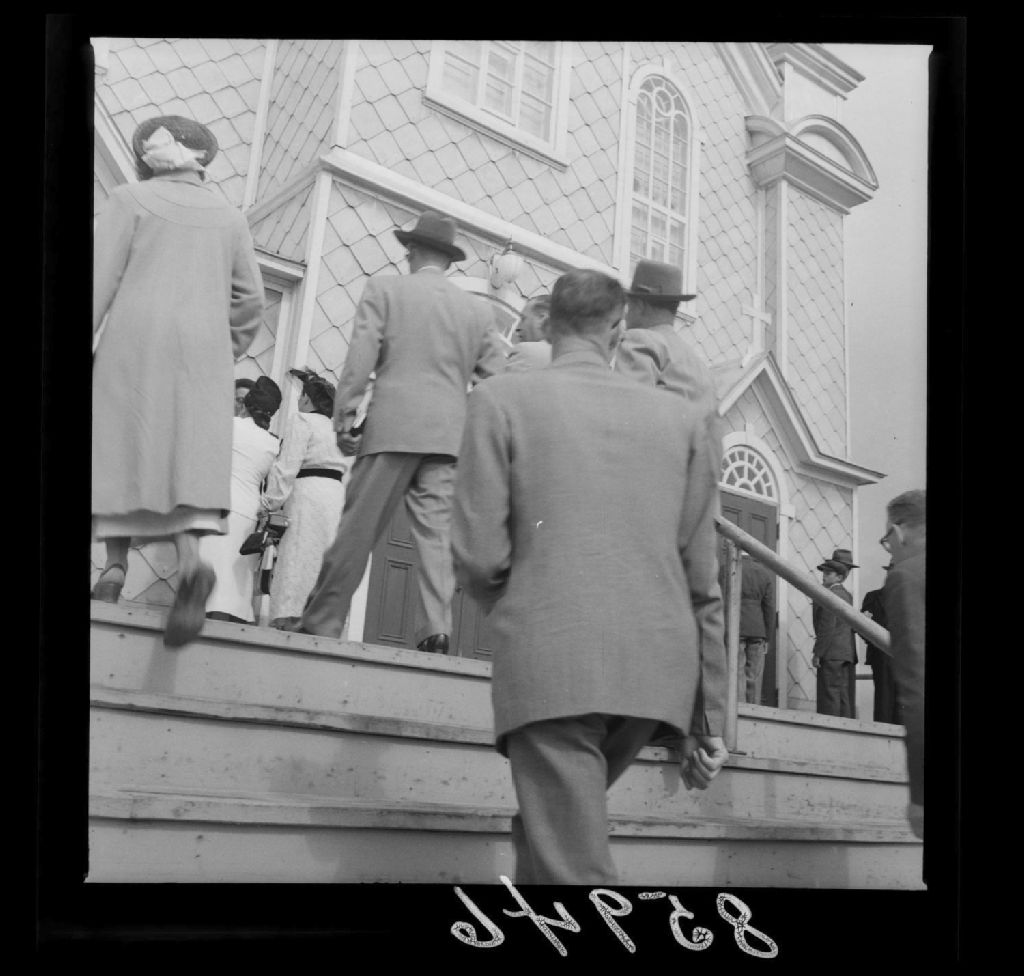 Àl'entrée de la grande messe: L'Honorable J.D.Bégin avec le missel, le maire Émilien Bégon, Luc Morin au premier plan, Palmarolle, Abitibi-ouest