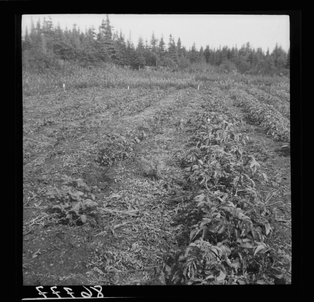 Apparence des plants de pommes de terre plantés dans le sable de Moisie avec application de varech et d'engrais chimiques. À remarquer l'enroulement des feuilles des plants sur la parcelle qui a reçu l'engrais chimiques. Côte-Nord