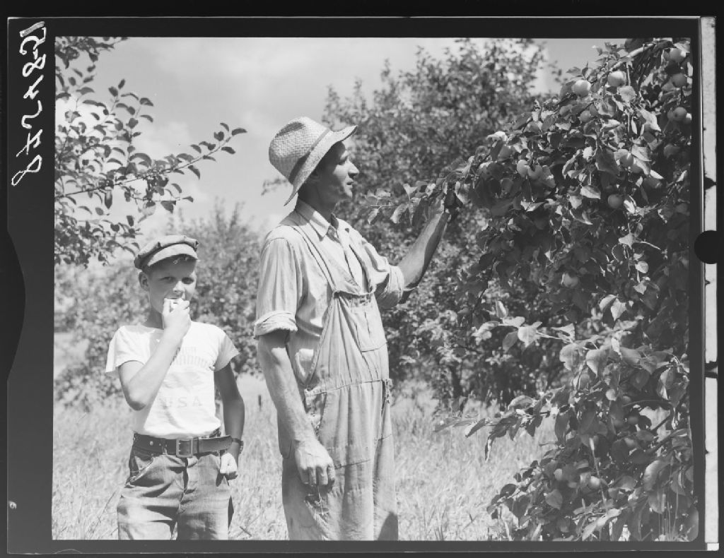 Dans le verger chez Hugh Dolan Monagan. Clarenceville, comté Missisquoi., 1951, Archives nationales à Québec, Fonds Ministère de la Culture et des Communications, (03Q,E6,S7,SS1,D2,P87548), Omer Beaudoin.