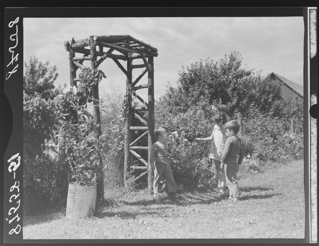Enfants près d'une haie chez Jos Desranleau. Clarenceville, comté Missisquoi., 1951, Archives nationales à Québec, Fonds Ministère de la Culture et des Communications, (03Q,E6,S7,SS1,D2,P87558), Omer Beaudoin.