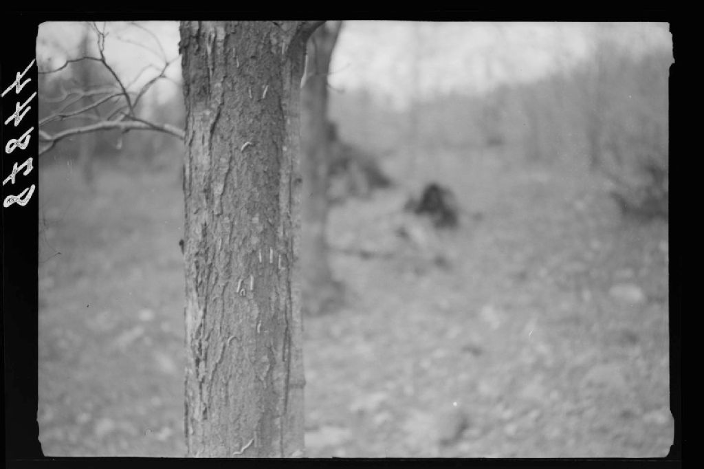 Chenilles à bosse rouge du chêne (Symmerista Albifrons) montant sur des érables à sucre qu'elles sont en train de défolier à Pontbriand, comté de Mégantic, 1952, Archives nationales à Québec, Fonds Ministère de la Culture et des Communications, (03Q,E6,S7,SS1,D2,P87844), Roch Delisle.