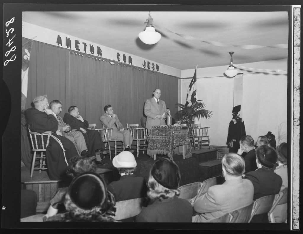 Le révérend Frère Georgius de la communauté des frères du Sacré-Coeur revêtant la toge Fellow du Collège d'Artisanat d'Angleterre, le révérend Père Albert de l'Ordre des Frères Mineurs, commissaire d'écoles , monsieur J. W. Caron, inspecteur général adjoint du département de l'Instruction publique et monsieur Chalifour pro-maire à l'École Saint-Charles Limoilou, Québec, 1951, Archives nationales à Québec, Fonds Ministère de la Culture et des Communications, (03Q,E6,S7,SS1,D2,P88428), Neuville Bazin.