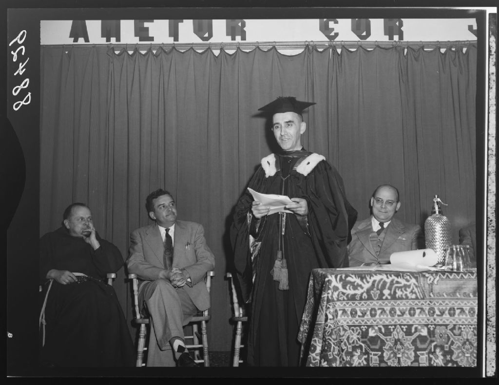 Le révérend Frère Georgius de la communauté des frères du Sacré-Coeur revêtant la toge Fellow du Collège d'Artisanat d'Angleterre, le révérend Père Albert de l'Ordre des Frères Mineurs, commissaire d'écoles , monsieur J. W. Caron, inspecteur général adjoint du département de l'Instruction publique et monsieur Chalifour pro-maire à l'École Saint-Charles Limoilou, Québec, 1951, Archives nationales à Québec, Fonds Ministère de la Culture et des Communications, (03Q,E6,S7,SS1,D2,P88429), Neuville Bazin.