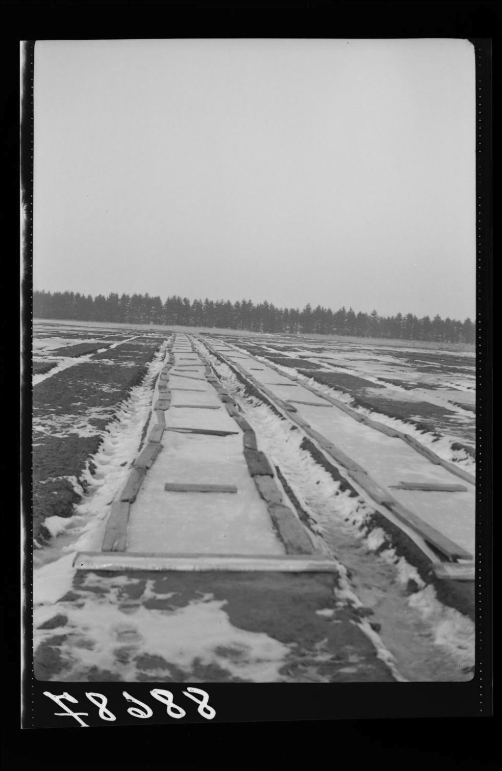 Papier cellophane placé sur les planches de semis. Ce papier tout en protégeant les semences du gel et du dégel permet la germination uniforme par la formation de gouttelettes d'eau. Pépinière provinciale de Berthierville