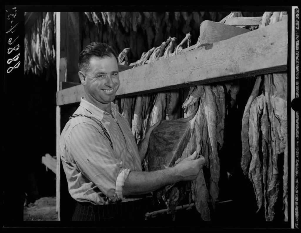 Paul Abel Arès montre son tabac à cigare dans le séchoir. Saint-Césaire, comté Rouville., 1951, Archives nationales à Québec, Fonds Ministère de la Culture et des Communications, (03Q,E6,S7,SS1,D2,P88864), Omer Beaudoin.