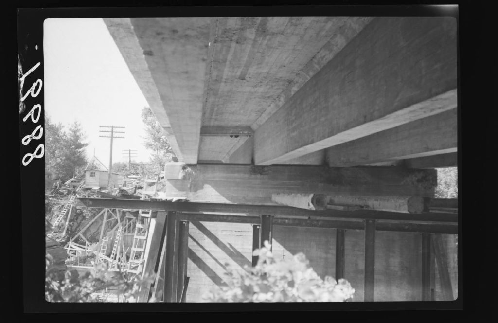 Pont Prouty Crossing traversant la rivière Coaticook entre Canton Adcot et Waterville. Effritement de la tête du pilier sur les poutres en béton, 1951, Archives nationales à Québec, Fonds Ministère de la Culture et des Communications, (03Q,E6,S7,SS1,D2,P88991), J. Émile Chevalier.