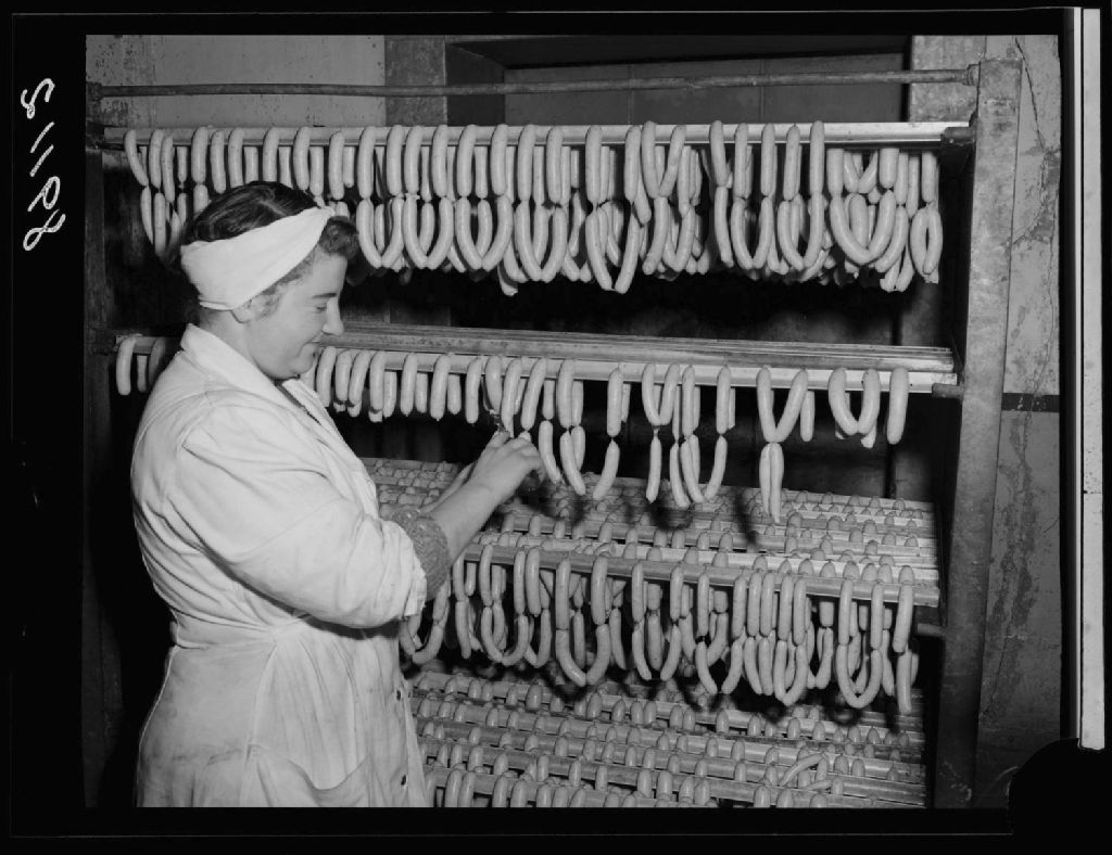Saucisses pure lard Brookfield sur ses supports avant le séchage. Swift Canadian Co. Québec