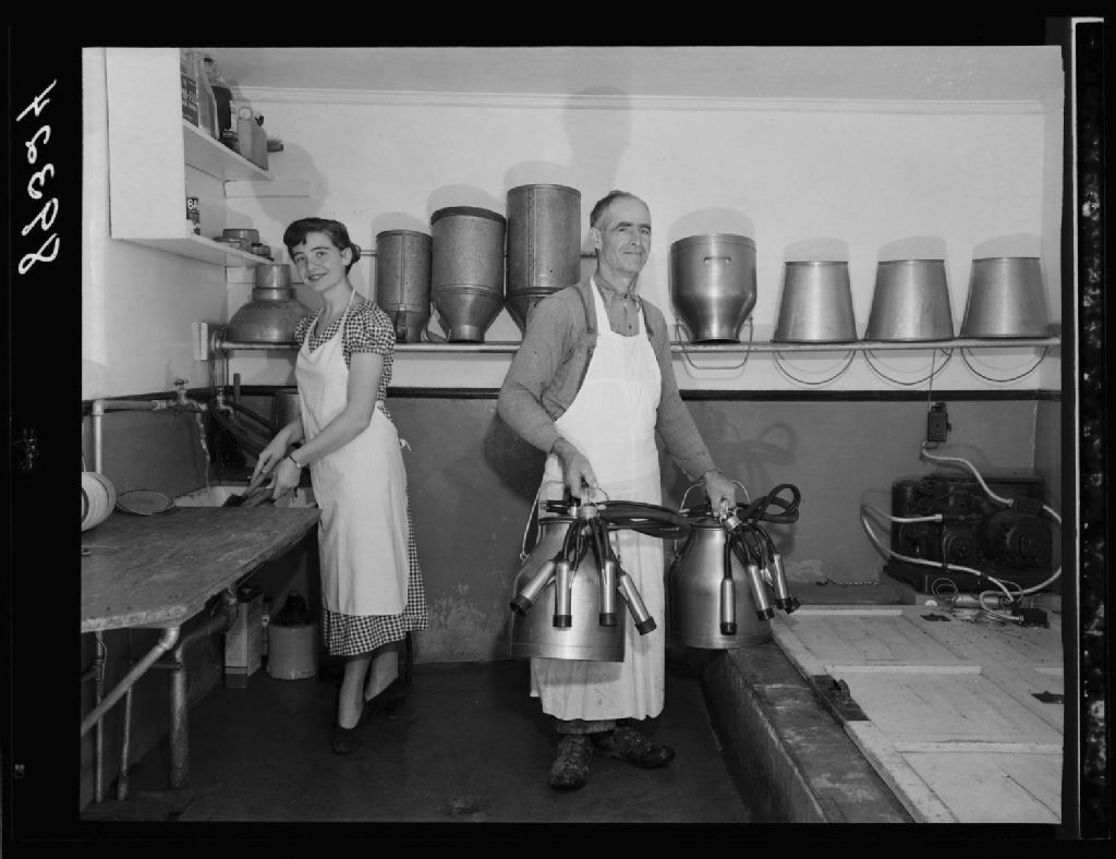 M. et Mlle Marcil dans la laiterie. Chez Lorenzo Marcil, Chambly-Bassin., 1951, Archives nationales à Québec, Fonds Ministère de la Culture et des Communications, (03Q,E6,S7,SS1,D2,P89324), Omer Beaudoin.