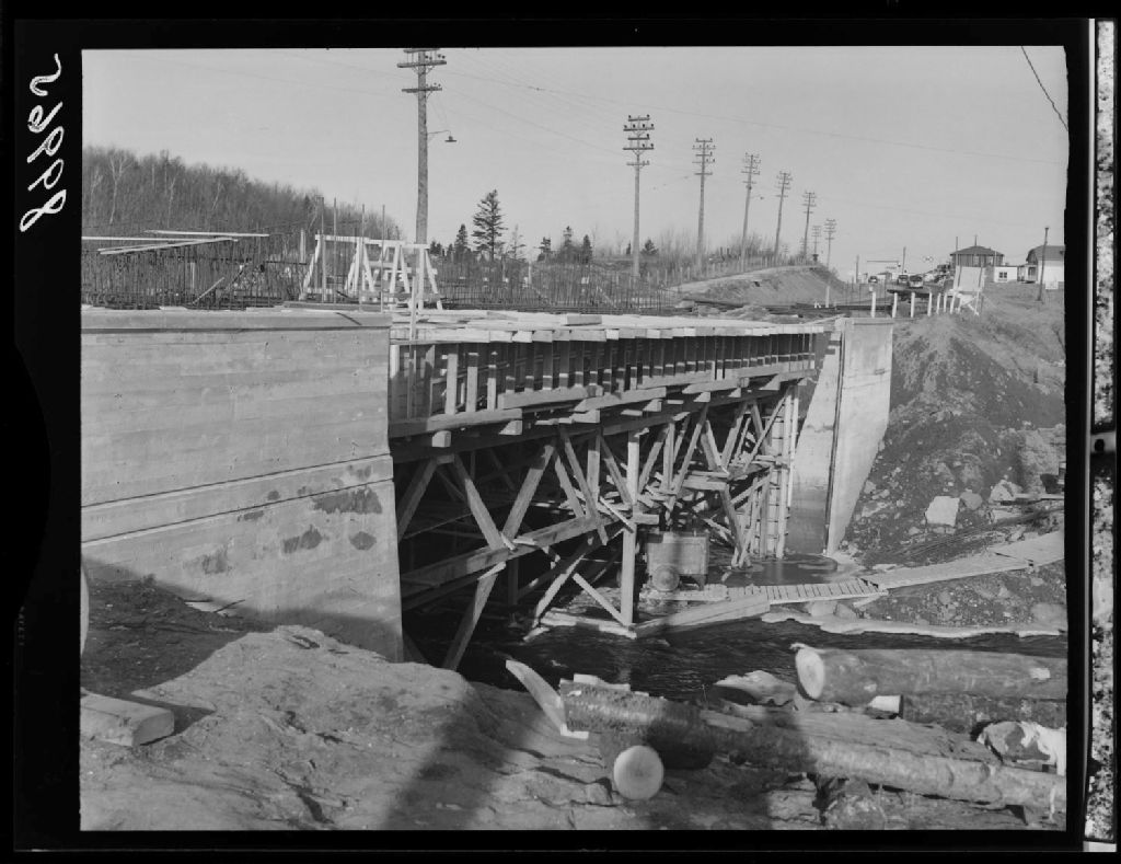 Pont en construction, Saint-David de Lévis, 1951, Archives nationales à Québec, Fonds Ministère de la Culture et des Communications, (03Q,E6,S7,SS1,D2,P89965), J.W.Michaud.