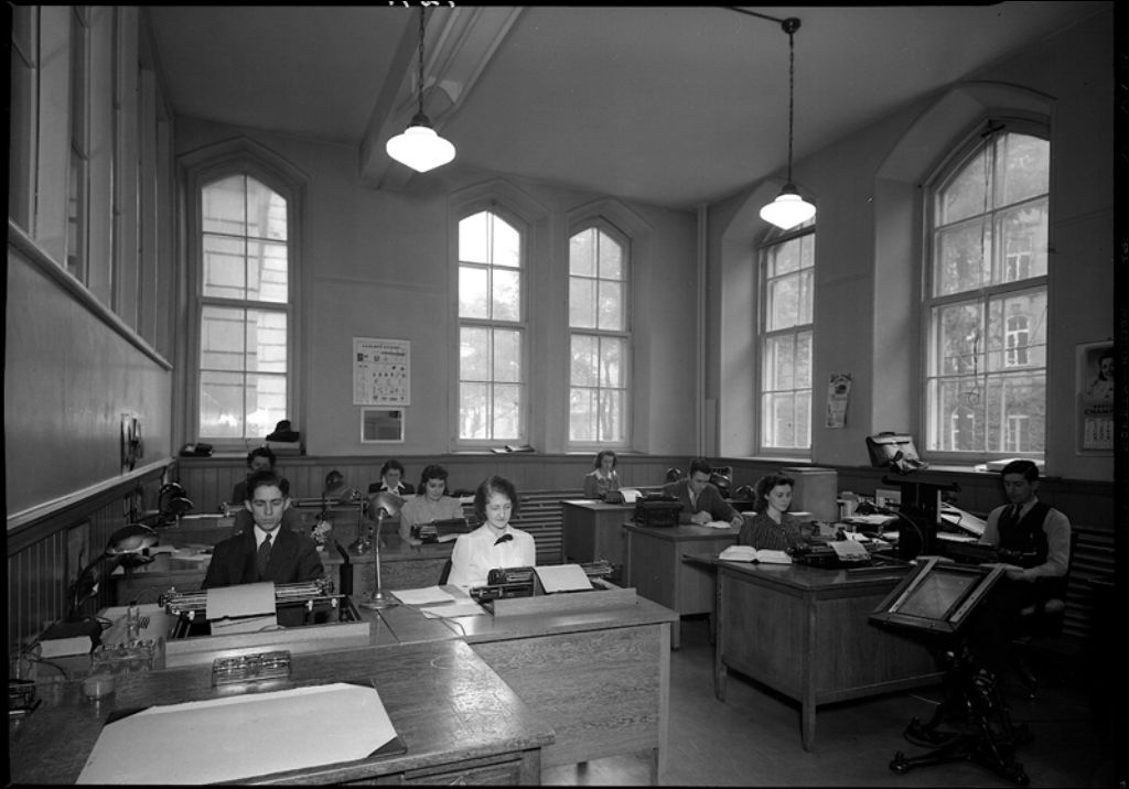 Salle des dactylographes du service de Ciné-Photo, 6 octobre 1942, Archives nationales à Québec, Fonds Ministère de la Culture et des Communications, (03Q,E6,S7,SS1,D2,P9291), Raymond Audet.