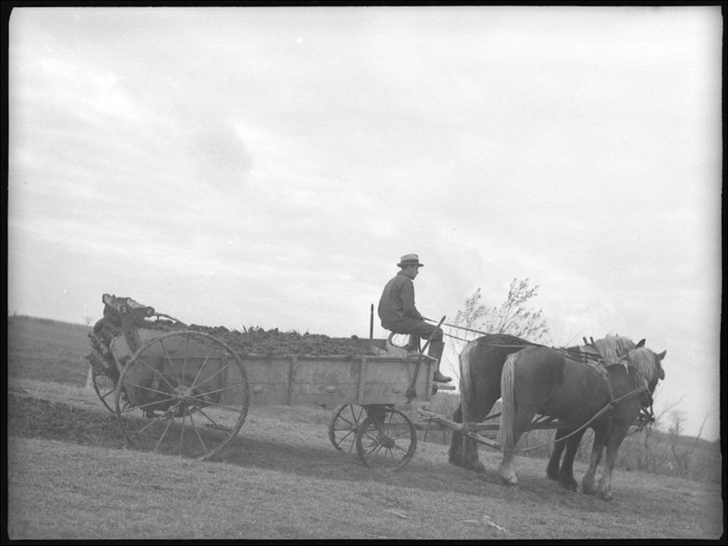 Épandage de fumier, image pour le calendrier de colonisation, 1942, Archives nationales à Québec, Fonds Ministère de la Culture et des Communications, (03Q,E6,S7,SS1,D2,P9831), Donat-C. Noiseux.