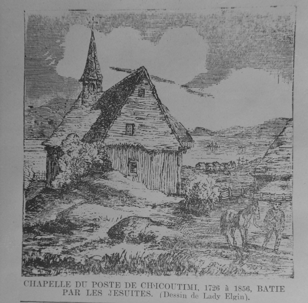 Chicoutimi, Chicoutimi - Chapelle - Chapelle bâtie en 1726-1727 par le Père Pierre Laure, d'après un dessin de Lady Elgin vers 1849, 1953, Archives nationales à Québec, Fonds ministère de la Culture et des Communications, (03Q,E6,S8,SS1,SSS325,D1417), Gérard Morisset.