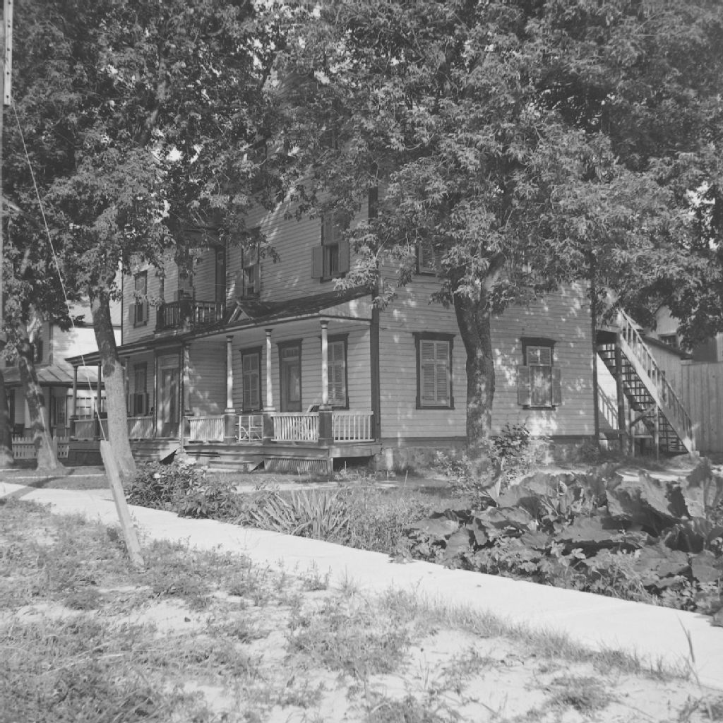 Saint-Benoît, Deux-Montagnes - Maisons - Habitations en bois en face de l'église, 1948, Archives nationales à Québec, Fonds ministère de la Culture et des Communications, (03Q,E6,S8,SS1,SSS368,D1570), Gérard Morisset.